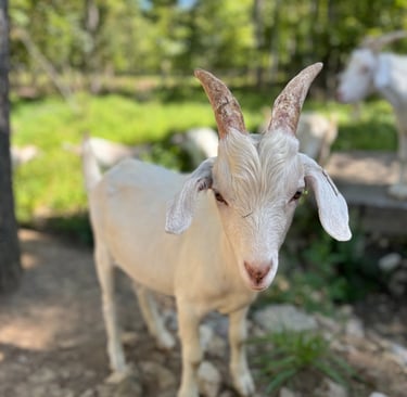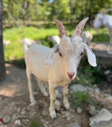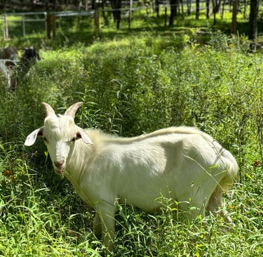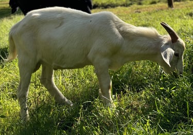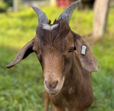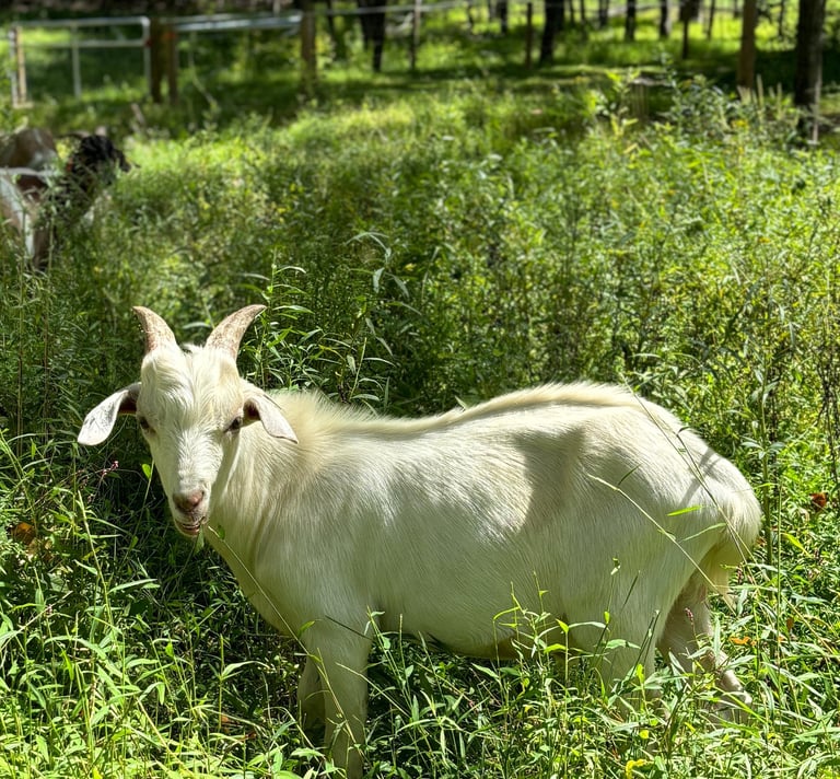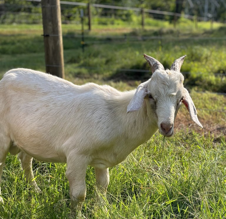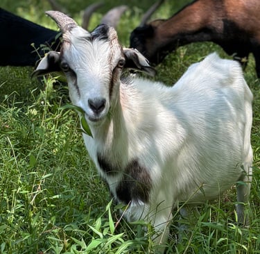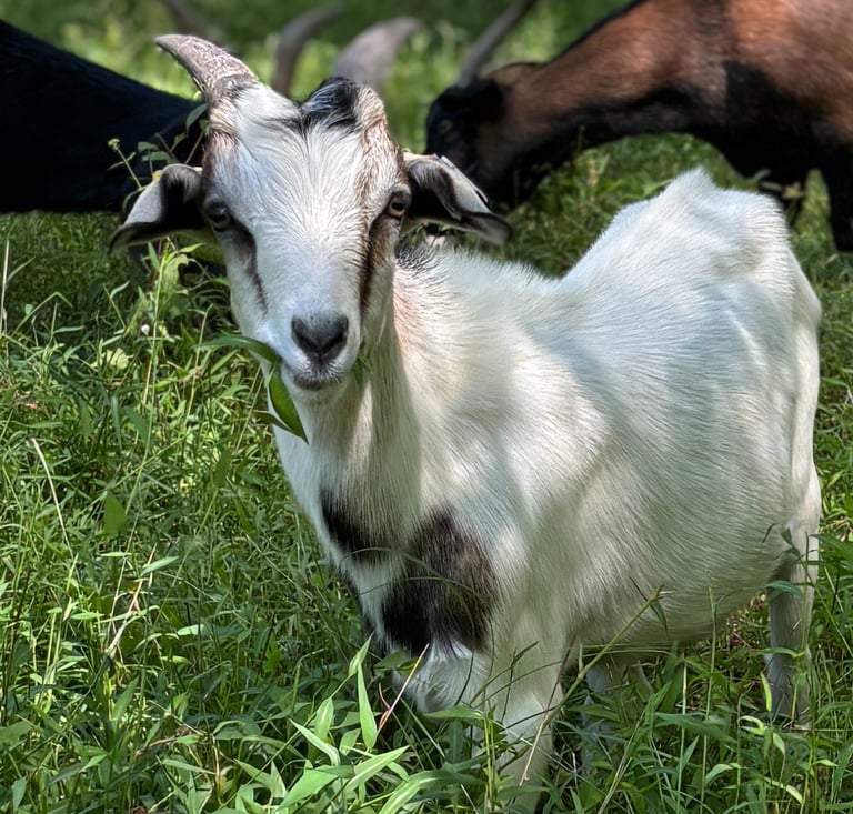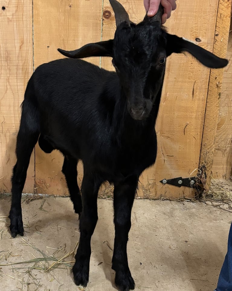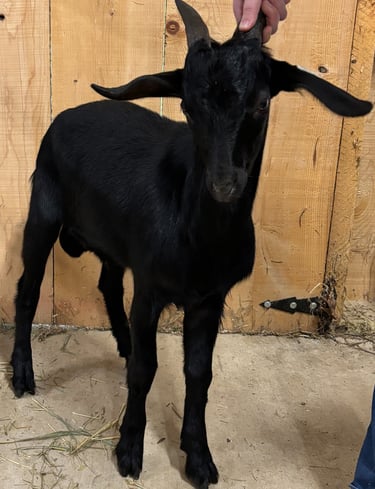 This young buck is quite the stud, often seen attempting to flirt with the young does and strutting around the farm. Friendly with all the other everyone, we are confident he will make an excellent sire someday.